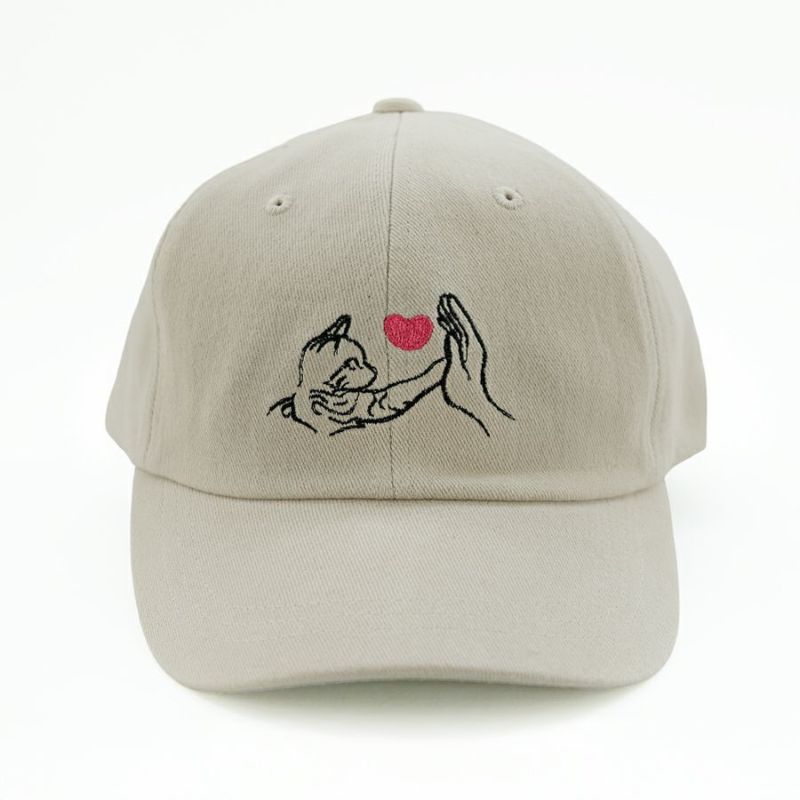 フロントに「猫×ハート×ハイタッチ」の刺繍をあしらった、遊び心たっぷりのキャップ